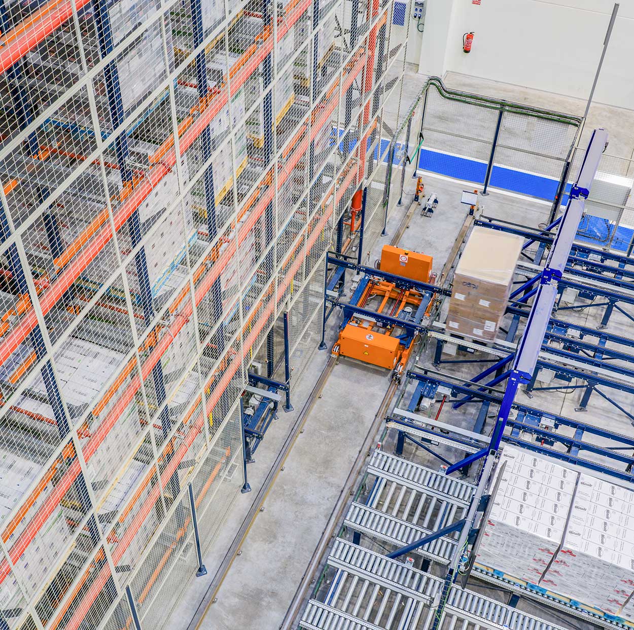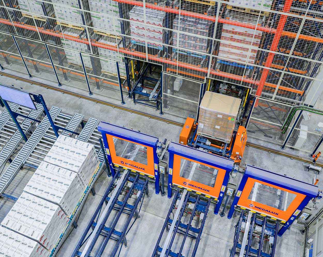 Los ingredientes y el material auxiliar con los que Herba Ricemills elabora sus arroces se descargan en muelles y se introducen en el depósito automático mediante tres puestos de entrada e inspección situados en el lateral del edificio. Un conjunto de AGV traslada la mercadería y le da entrada o salida a los transportadores de pallets, que finalmente la emplazan en el Pallet Shuttle automático con transelevador. La coordinación entre estos sistemas permite un flujo 100% automático sin intervención manual.